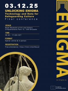 After three fruitful years, the ENIGMA Consortium is pleased to announce the ENIGMA Final Conference, titled “Unlocking ENIGMA – Technology and Data for Safeguarding Cultural Heritage,” to be held on 3 December 2025 at the Royal Museums of Art and History in Brussels and online.