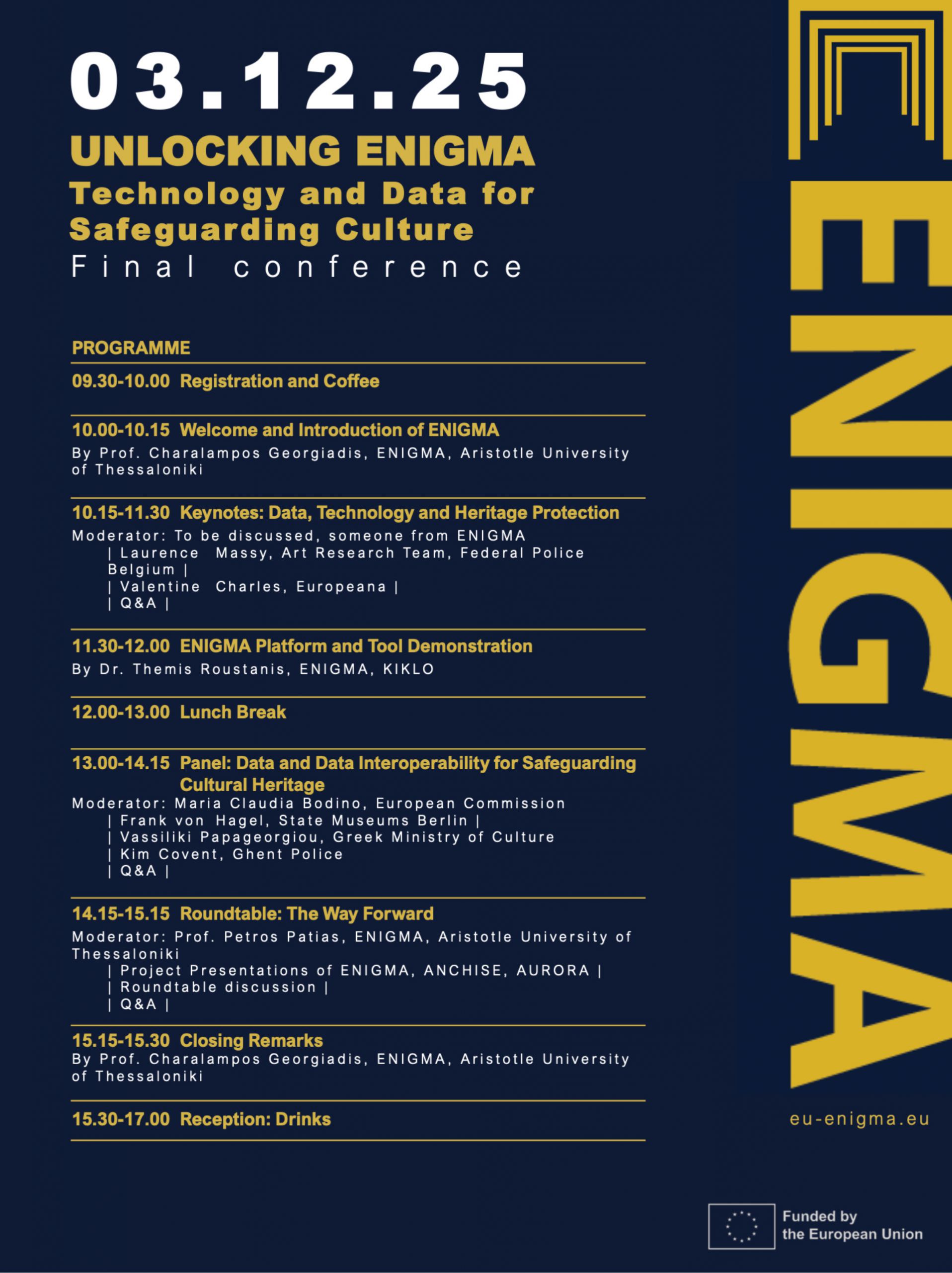 Over the past years, the ENIGMA project, funded by the European Union, has developed innovative tools and a collaborative platform to enhance data sharing, traceability, and interoperability in the cultural heritage sector. The final conference will showcase these achievements and provide a space for dialogue and future collaboration.
