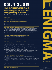 Over the past years, the ENIGMA project, funded by the European Union, has developed innovative tools and a collaborative platform to enhance data sharing, traceability, and interoperability in the cultural heritage sector. The final conference will showcase these achievements and provide a space for dialogue and future collaboration.